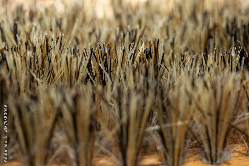 Detalle macro de cerdas de un cepillo doméstico en tonos marrones. / Macro detail of household brush bristles in brown tones.