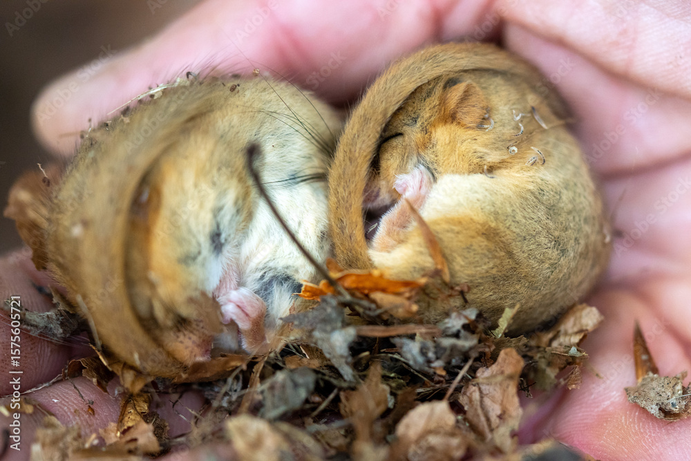 Two hazel dormice rolled up next to each other in torpor on a hand