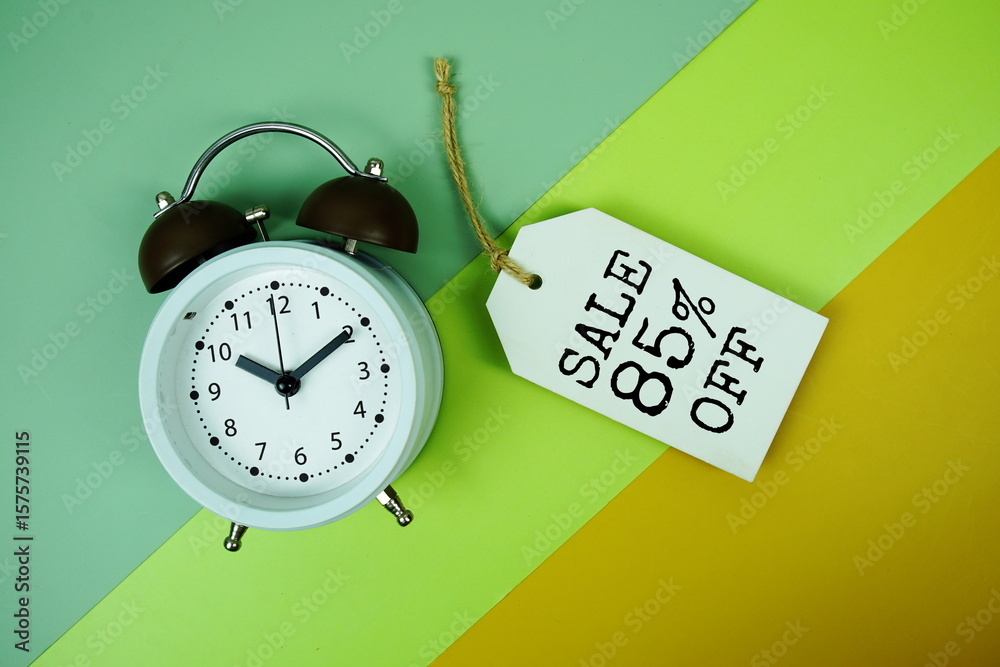 Sale 85% off text on price tag with alarm clock on green, yellow geometric background