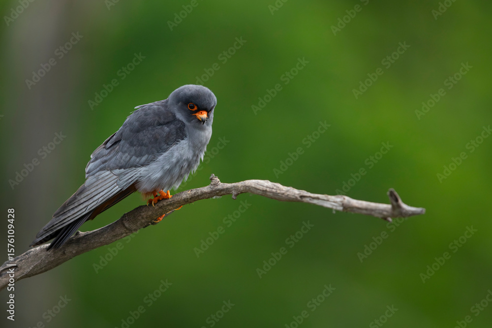 adult male red-footed falcon (Falco vespertinus) perching on a branch, found in Hortobagy National Park