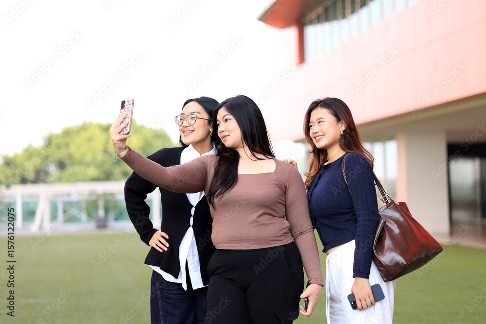 Three College Student Take Selfie Photo Group using Mobile Phone