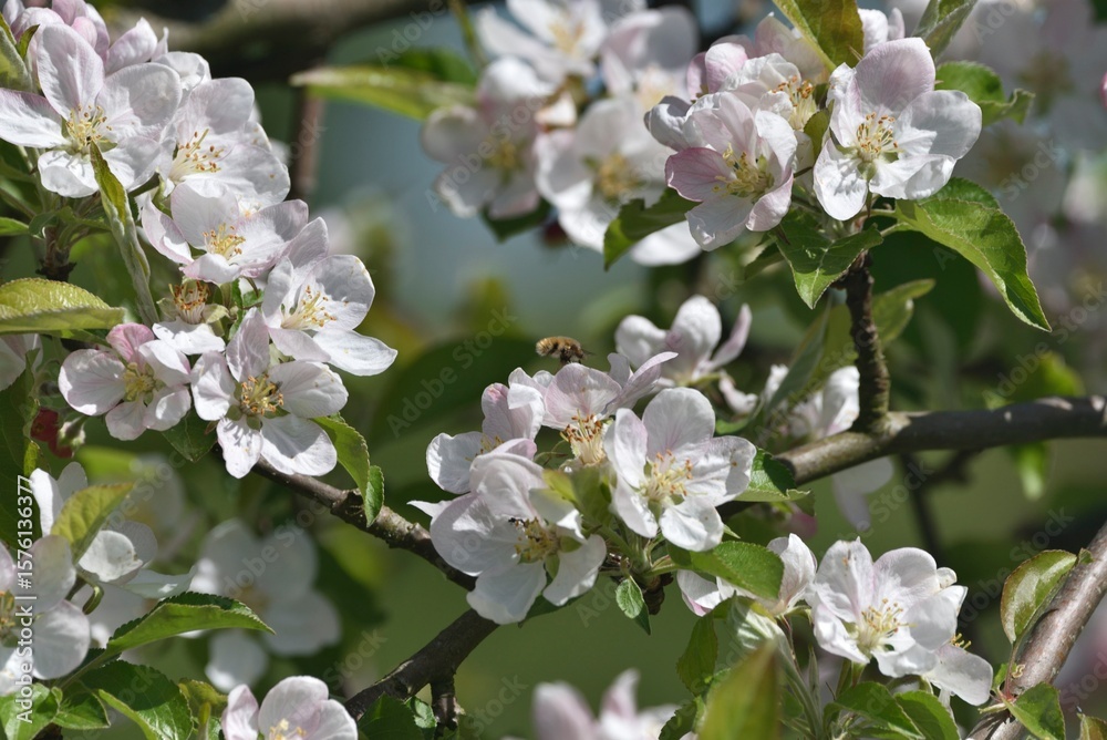 A bee gathers pollen from delicate apple blossoms with white and pink petals. A vivid springtime close-up celebrating nature’s pollinators.