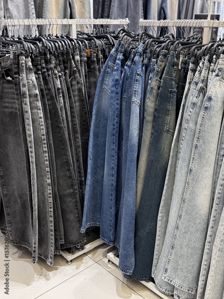 Denim clothing store featuring a variety of jeans on hangers, showcasing a wide selection of styles and sizes.