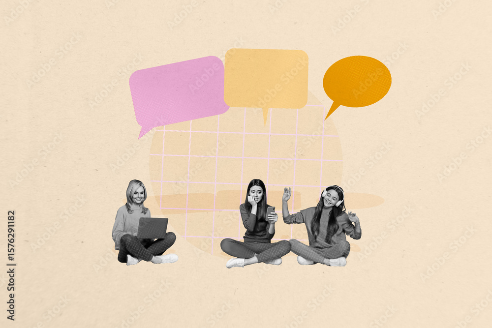 Image 3d poster artwork collage of happy girl guy stand bubble communication chatterbox speech scribble dialogue cloud talk