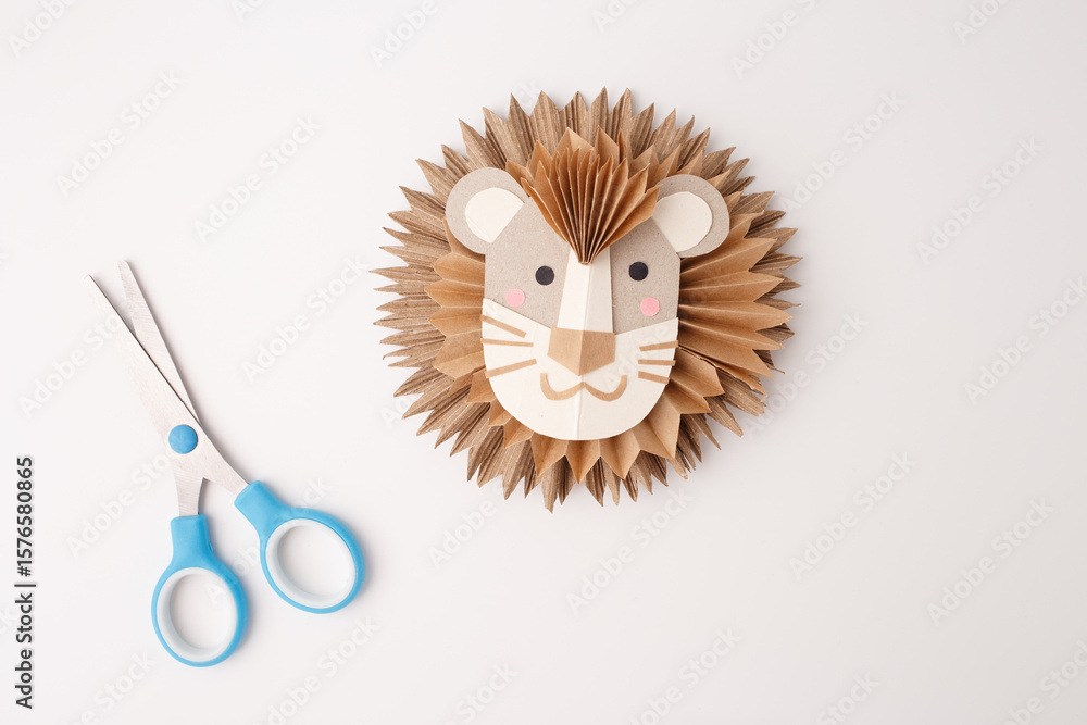 Paper lion craft with scissors on white background, ideal for educational materials, craft blogs, toy store branding, preschool marketing, or DIY tutorials,