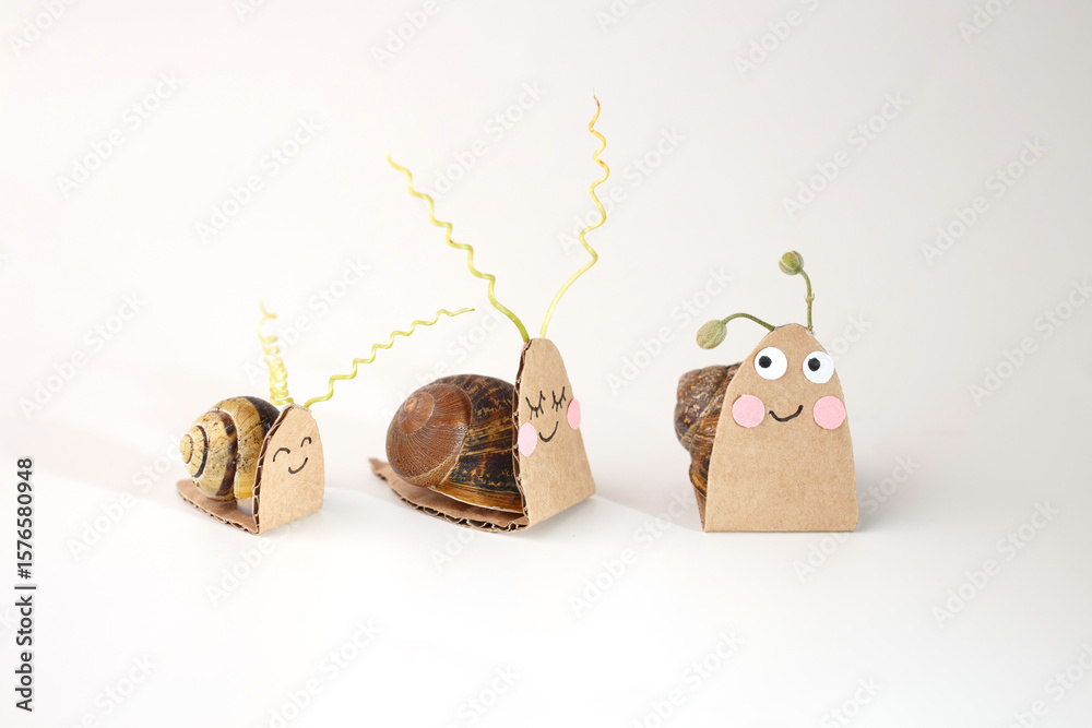 Snails with handmade cardboard costumes as cute characters, crafted for creative use in animation, design, social media, kids content, ideal for branding studios and children media companies,