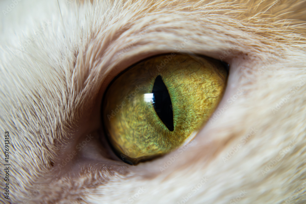 Macro close-up of cat’s eyes in natural light, revealing detailed iris texture, visible veins and elliptical pupils—capturing feline vision and natural beauty