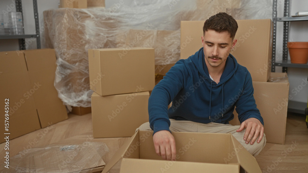 Young man unpacking box in new apartment surrounded by moving boxes and plastic covered furniture as he explores his new living space