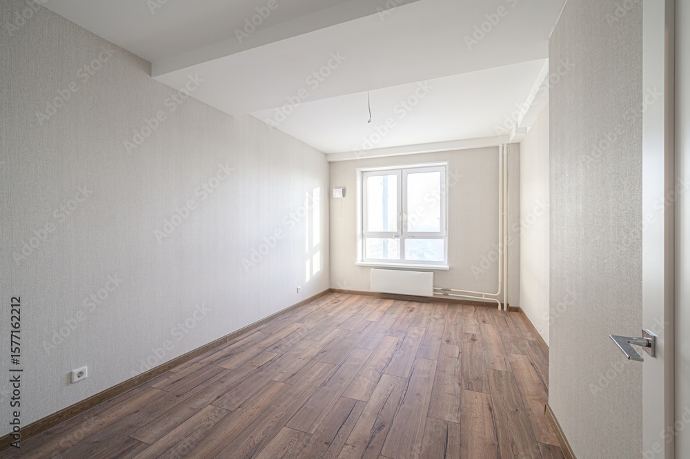 Bright, empty room with wood floor, light walls, window. Minimalist