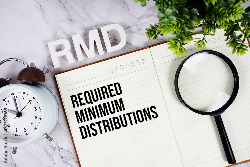 RMD - Required Minimum Distributions acronym on notepad, Business concept background
