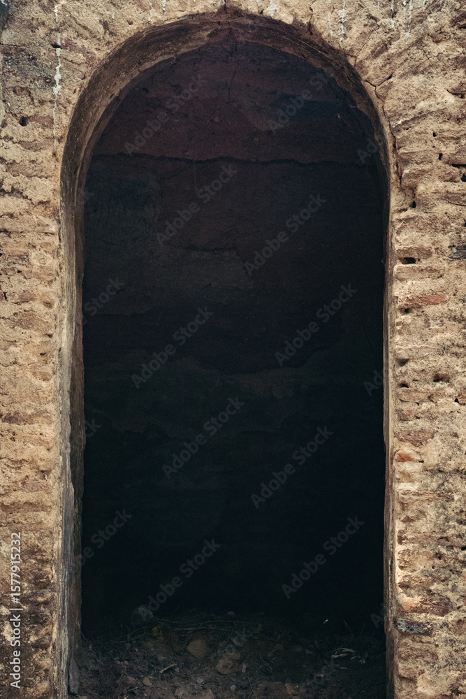 An arched doorway crafted from weathered stone stands open, revealing a shadowy interior and an inviting dark space.
