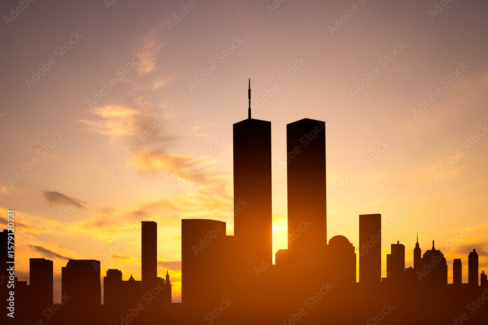New York skyline silhouette with Towers against the sunset. Patriot Day banner. 9.11.2001