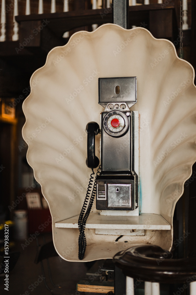 Vintage coin-operated rotary payphone with scallop-shaped booth backing and black handset, showcasing retro design and nostalgic communication technology