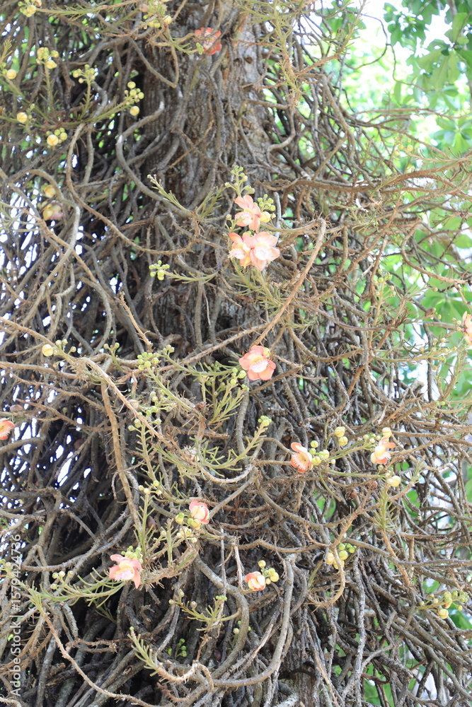 Cannonball tree flower in full bloom, exotic cannonball tree flower close-up with natural background, sacred cannonball tree flower symbol in tropical Asia