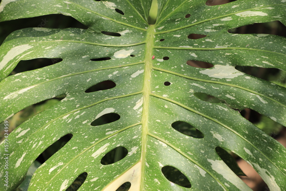 Close-up of monstera leaf in sunlight, showcasing natural monstera leaf texture and tropical monstera leaf pattern for botanical backgrounds
