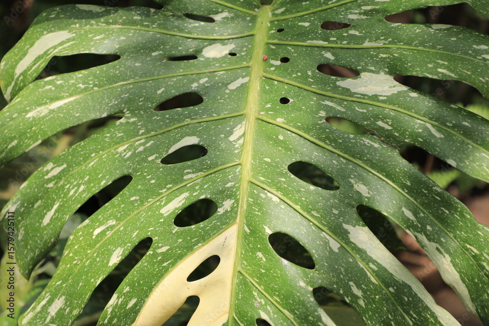 Close-up of monstera leaf in sunlight, showcasing natural monstera leaf texture and tropical monstera leaf pattern for botanical backgrounds