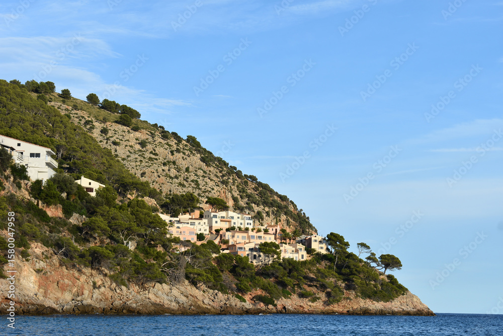Ferienhäuser drängen sich an die Klippen über der Bucht von Canyamel, Capdepera