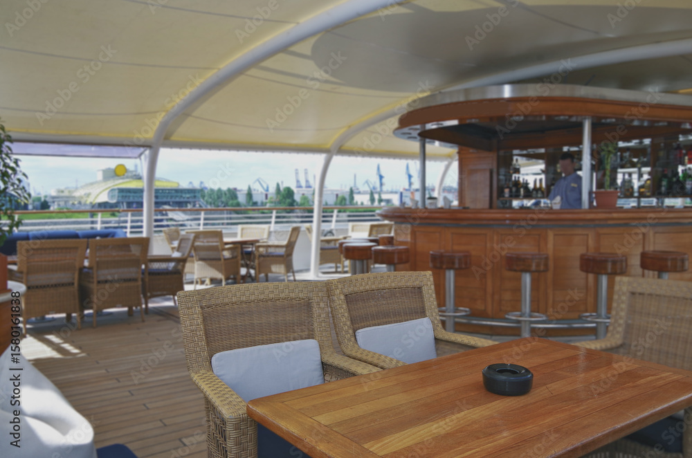 Outdoor promenade boat sun deck onboard modern luxury cruiseship cruise ship yacht liner with teak wood loungers and deck chairs for guests passengers