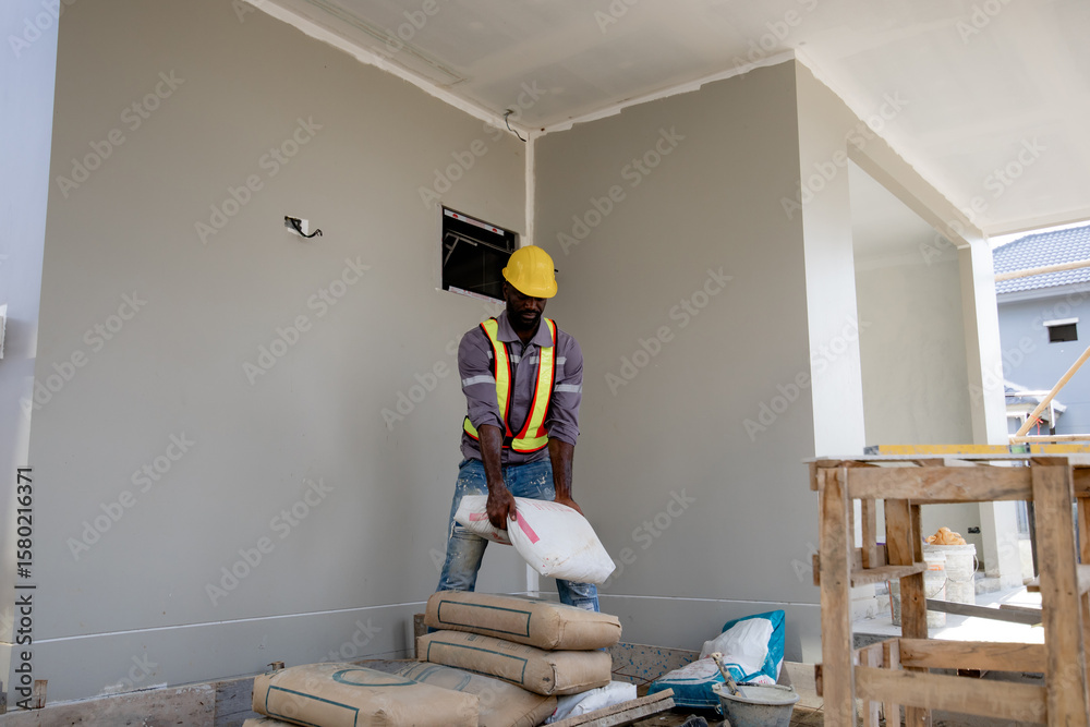 Worker is unloading the bags of cement an apartment is under construction, remodeling, renovation, Construction worker lifting a concrete bag in a house under reformation
