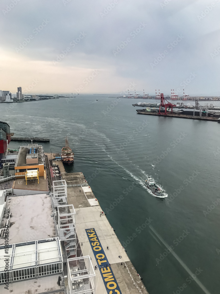 Harbor View of Osaka Port with Boats and Industrial Skyline