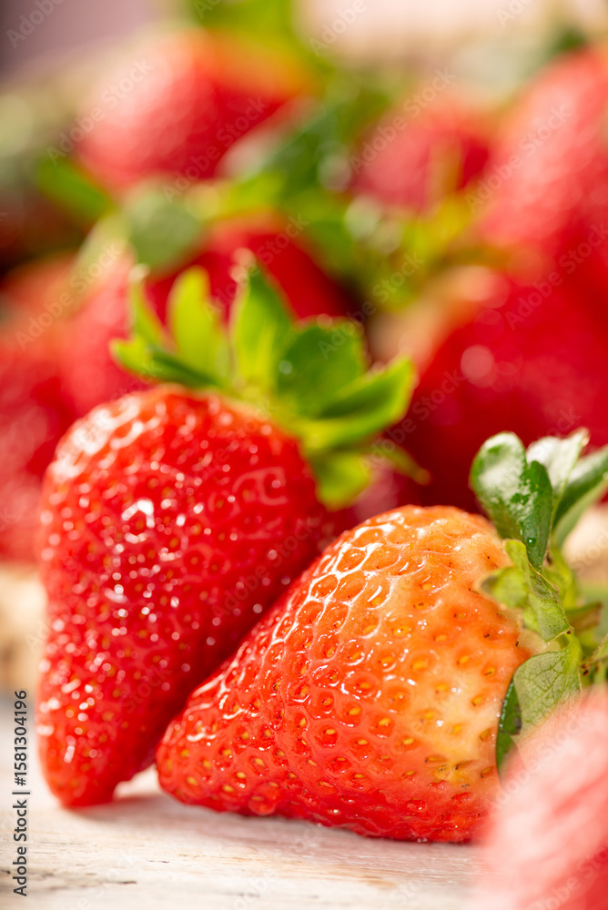 Strawberries, straw basket with beautiful strawberries on white rustic wooden surface, abstract background, selective focus.