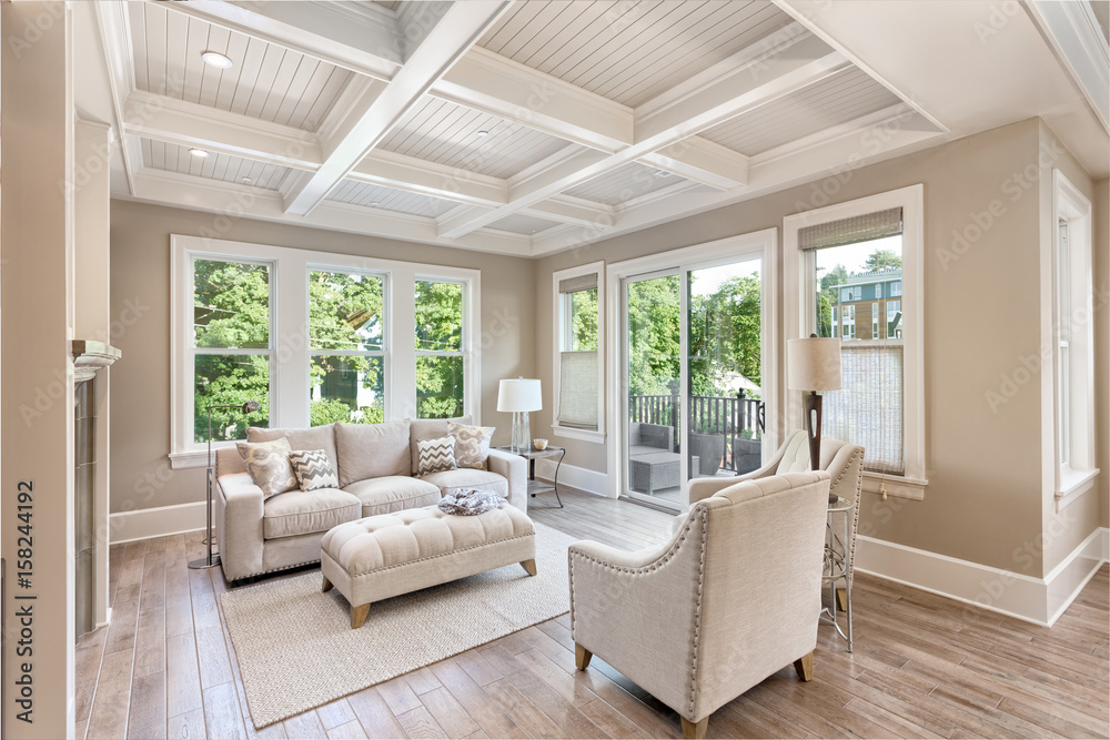 Beautiful living room with hardwood floors in new luxury home. Coffered ceiling adds elegant touch to this furnished living space. Lush trees provide scenic exterior view.