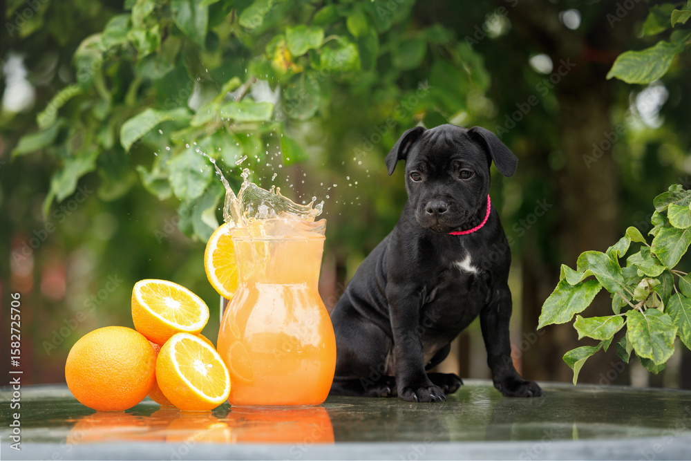 staffordshire bull terrier puppy posing with splashing orange juice outdoors