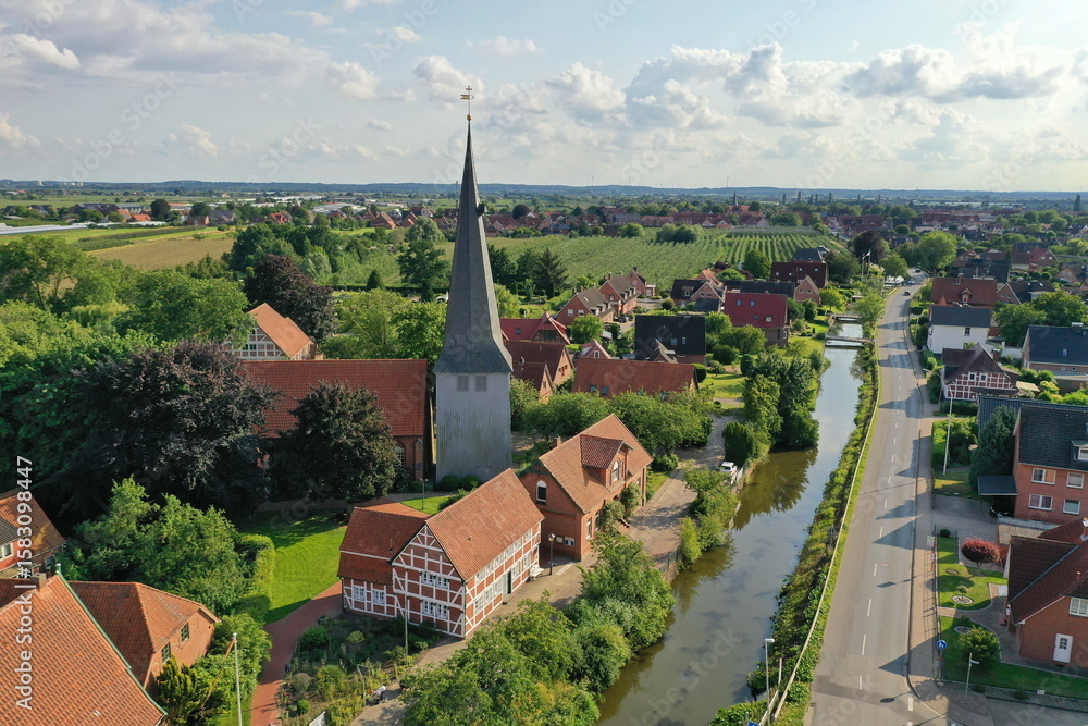 Deutschland, Niedersachsen, altes Land. Ortskern von Borstel / Jork mit Kirche St. Nikolai