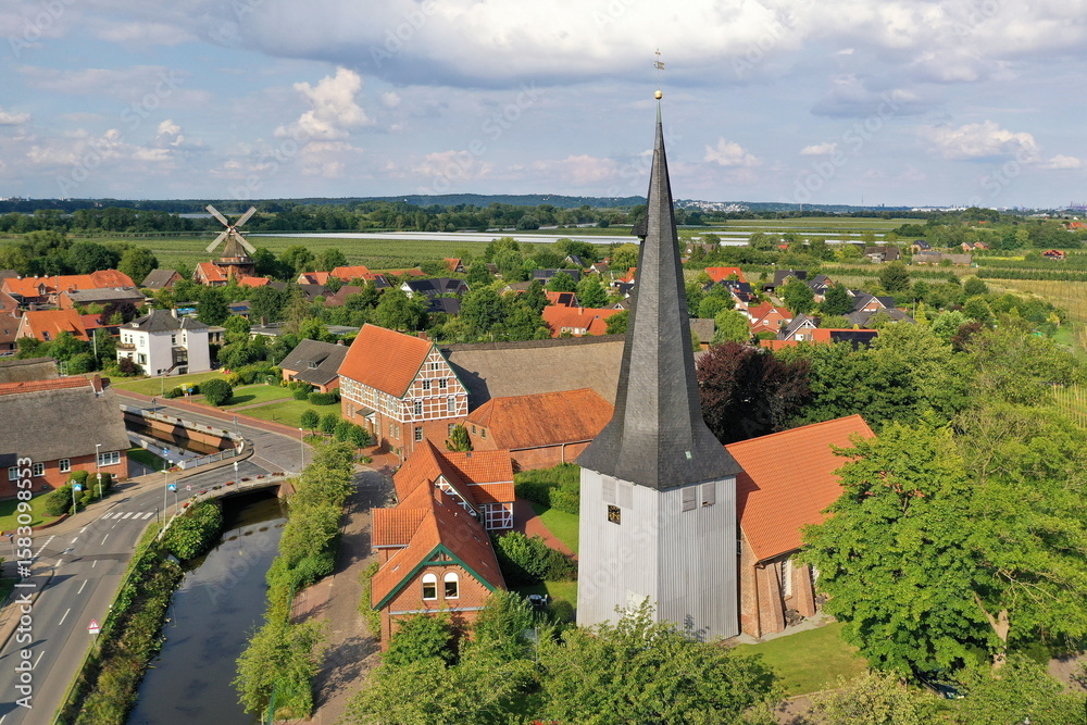 Deutschland, Niedersachsen, altes Land. Ortskern von Borstel / Jork mit Kirche St. Nikolai