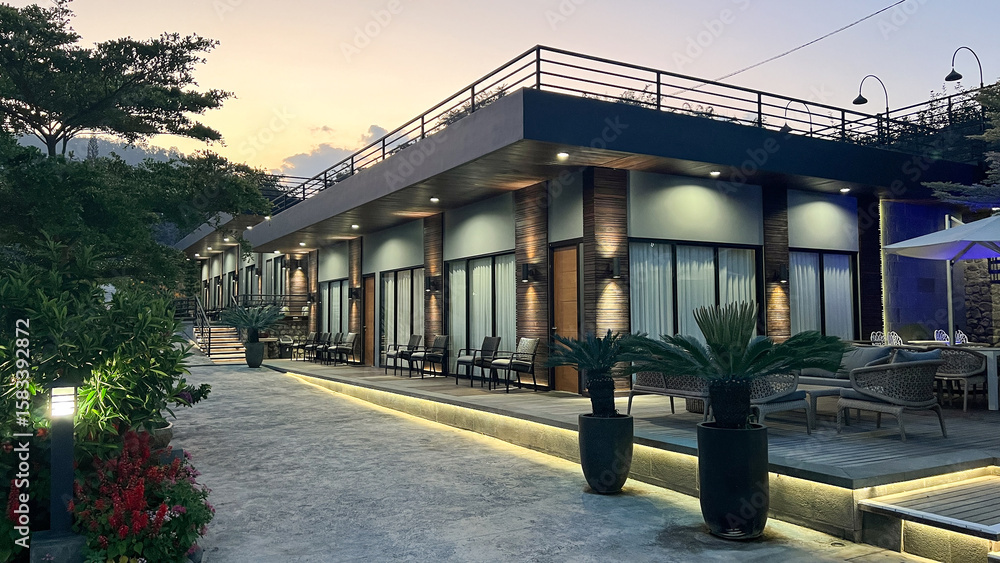 Home villa hotel with garden view of a tropical luxurious at sunset