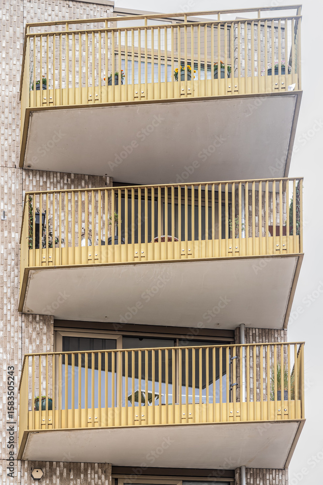 Yellow balconies of a modern apartment building in Amersfoort.