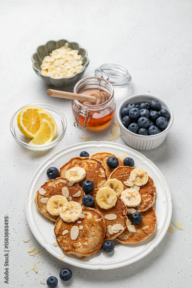 American banana pancakes with fresh blueberries, honey and almond petals. Healthy eating. Morning tasty homemade breakfast. Top view.