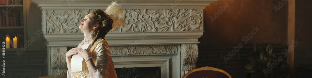Caucasian middle aged woman standing in ornate Baroque interior holding letter to chest, wearing elaborate hairstyle and period costume, appearing contemplative with eyes closed