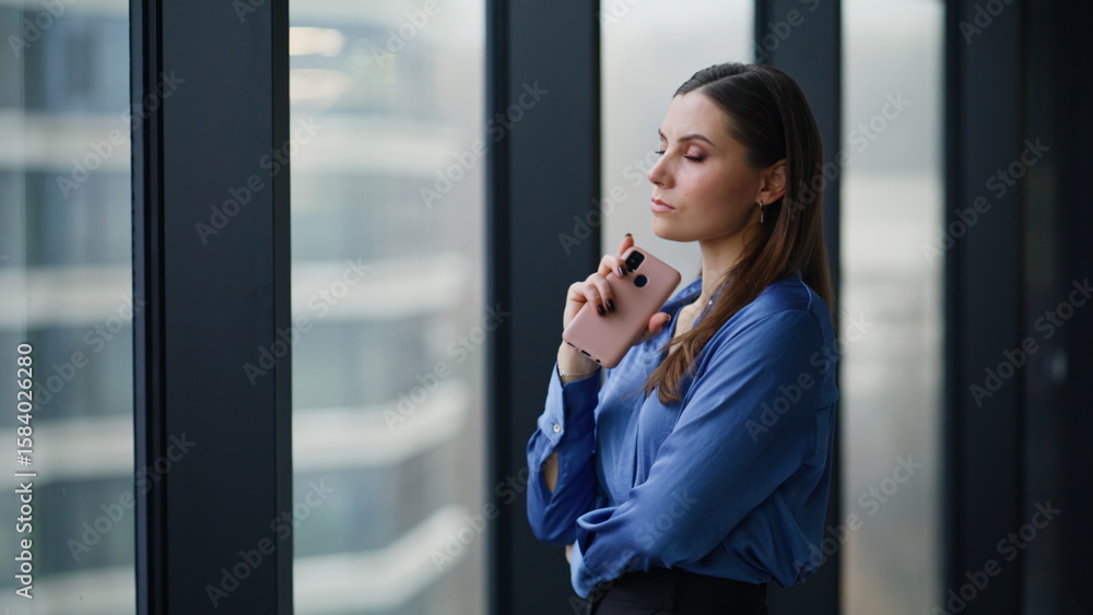 Thoughtful business owner standing by office window holding smartphone closeup.
