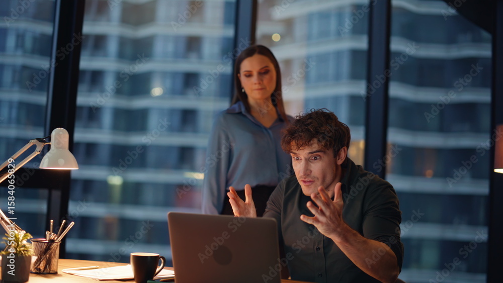 Annoyed business people videocalling frustrated documents mistake at dark office