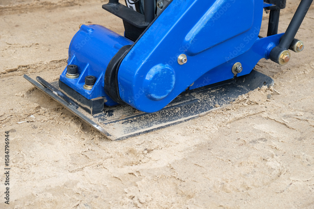 Construction tool - vibrating plate for compacting sand close-up. Process of preparing base for concrete slab, compacting sand at construction site.