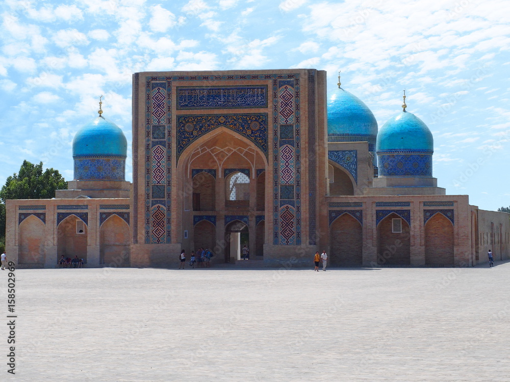 Frontal view of Barak-Khan Madrasah in Tashkent, Uzbekistan. Traditional shcool where students learn and live. Beautiful mosaics in entrance, behind there are rounded domes in blue, cyan and turquoise