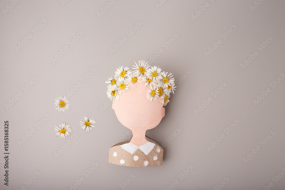 Creative paper figure with daisy hair and polka dot shirt on soft gray surface, perfect for children diy activities, eco friendly product visuals, seasonal art projects, floral branding,
