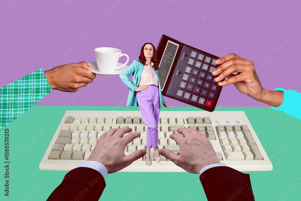 Banner full 3d photo image collage of hands type wireless keypad texting calculator money income coffee cup businessman woman