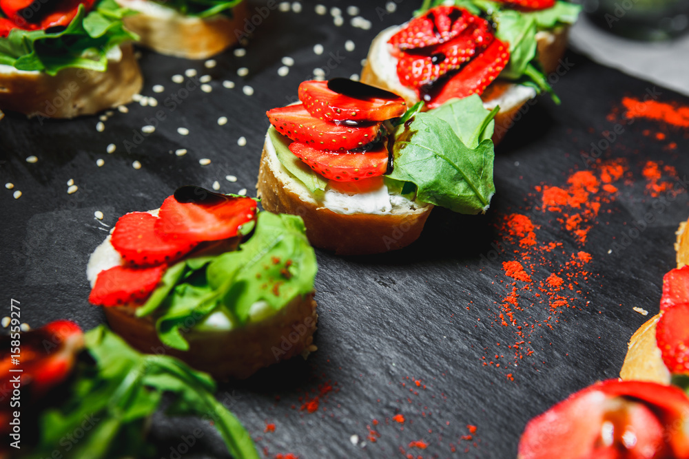 snacks with meat and vegetables. Tapas with salmon and pickled cucumber. Prosciutto with pears and arugula