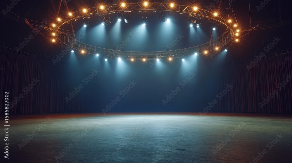 An empty- atmospheric circus ring illuminated by circular stage lights- evoking a sense of anticipation and nostalgia in a darkened- quiet space.