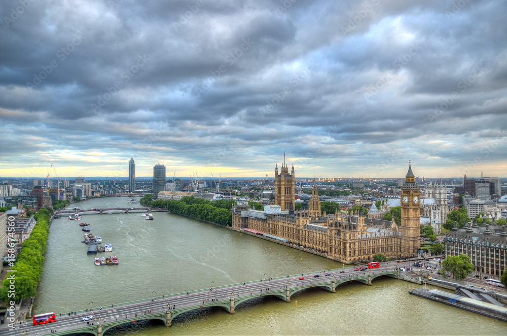 London Skyline landscape with Big Ben, Palace of Westminster, London Eye, Westminster Bridge, River Thames, London, England, UK...