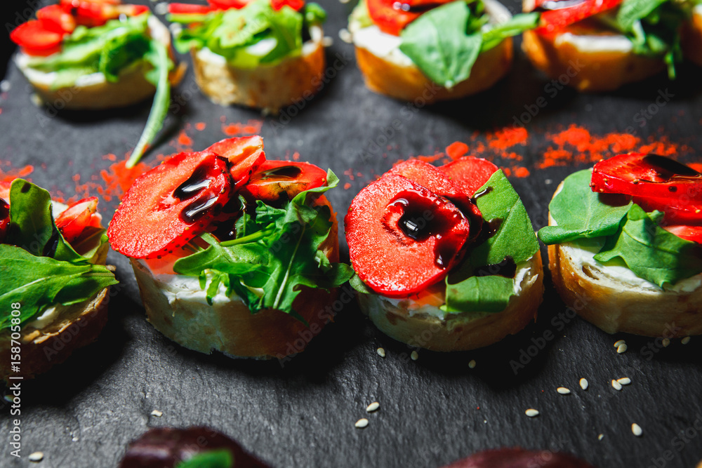 snacks with meat and vegetables. Tapas with salmon and pickled cucumber. Prosciutto with pears and arugula