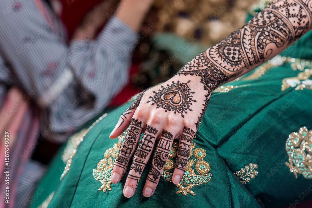 Henna, also known as mehndi, symbolizing good luck, prosperity, and joy for the bride. Mehndi henna tattoo on women hands. Intricate henna designs adorn the hands for a cultural ceremony