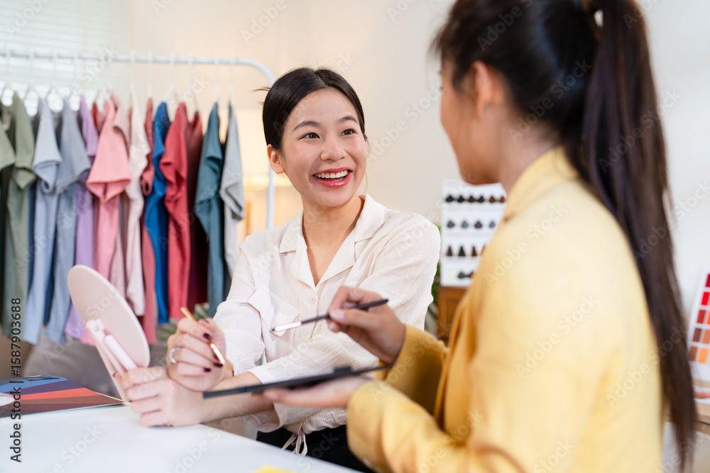 Young Asian woman doing personal color diagnosis for determining skin undertone and seasonal color palette. Beauty advisor. Make up , cosmetics color Swatch .