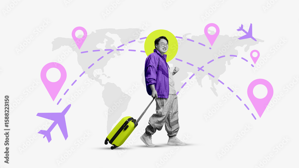 Collage-style pop-art visual of cheerful traveler with suitcase and global flight routes. Concept of promotional materials for summer travel, booking apps, youth-focused tourism UX.