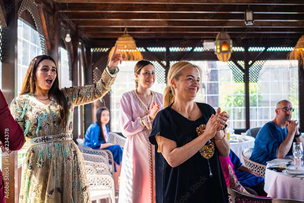 Multicultural group of people engage in lively Arab celebration at a vibrant gathering, showcasing traditional attire and joyful expressions. Clapping, laughter, and cultural appreciation.