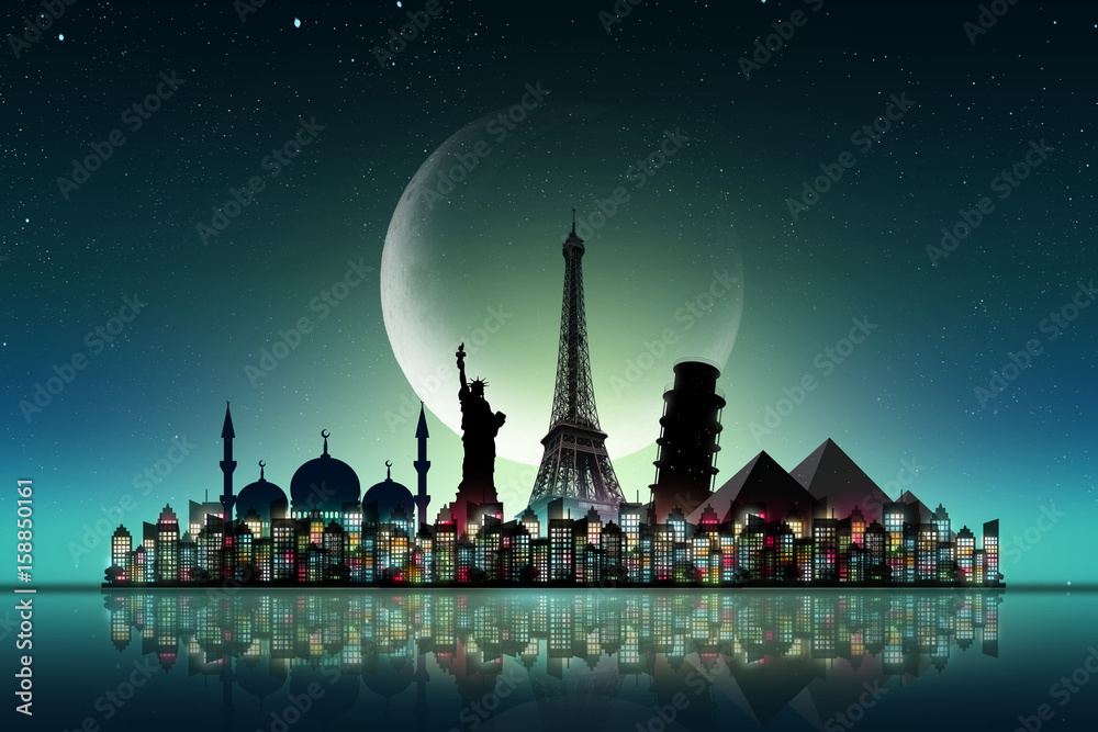 Travel background with famous world landmarks. Travel and Tourism Concept
