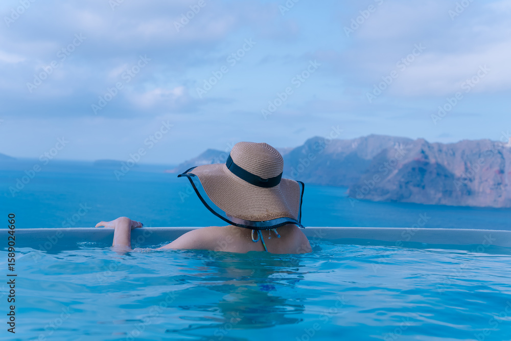 ギリシャのサントリーニ島で泳ぐ女性