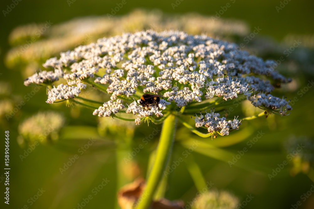 Bumblebee Pollinating White Wildflower Umbel in Golden Hour Macro Shot